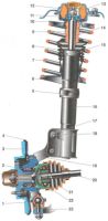 Амортизаторная стойка объединяет упругий элемент (пружину) и амортизатор. Металлическая пружина расположена соосно с амортизатором и закреплена на стойке. Для изменения линейной характеристики упругости пружины соосно с ней устанавливается буфер сжатия. В нижней части стойка соединена с поворотным кулаком. В верхней части она крепится к брызговику крыла с помощью резиновой втулки.
